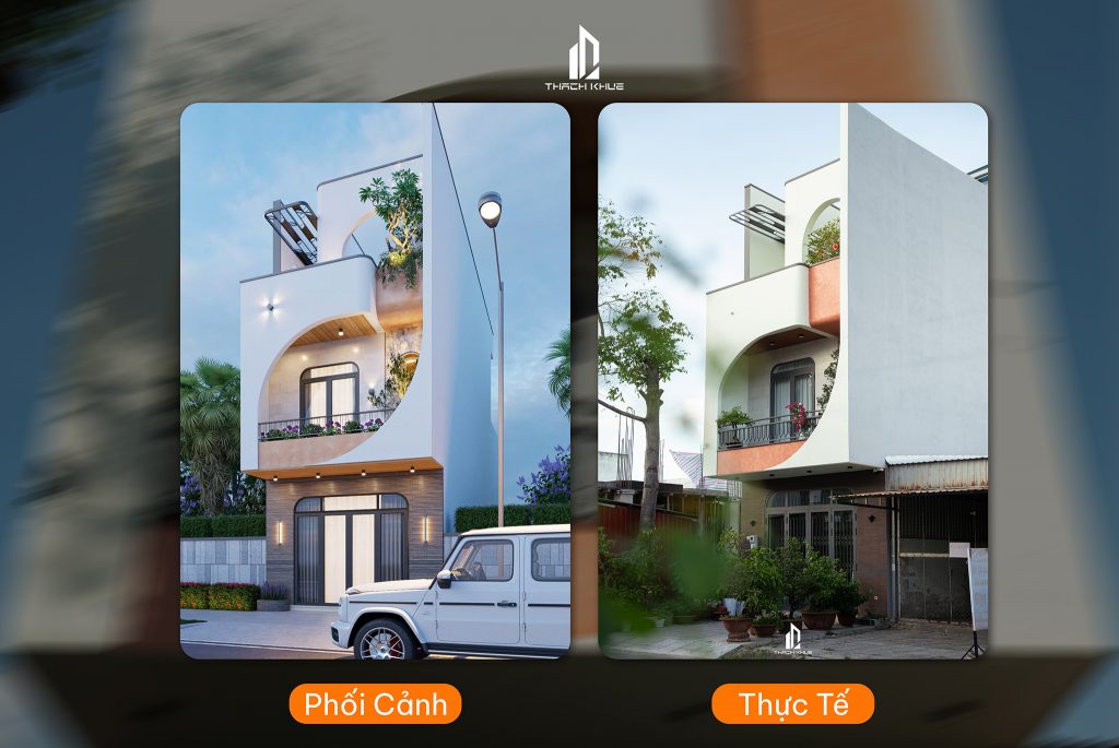 Thực tế: Công trình hoàn thiện vẫn giữ nguyên thiết kế mặt tiền hiện đại, ban công thoáng mát, cây xanh được bố trí đúng như bản vẽ. Màu sắc hài hòa, tạo cảm giác ấm cúng và gần gũi.